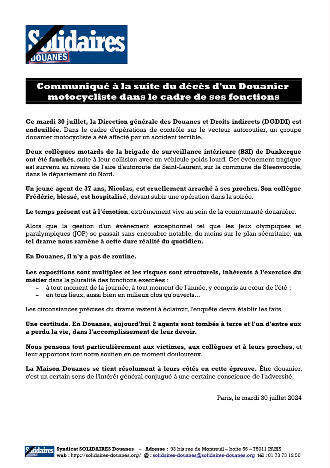 Communiqué à la suite du décès d’un douanier motocycliste dans le cadre de ses fonctions